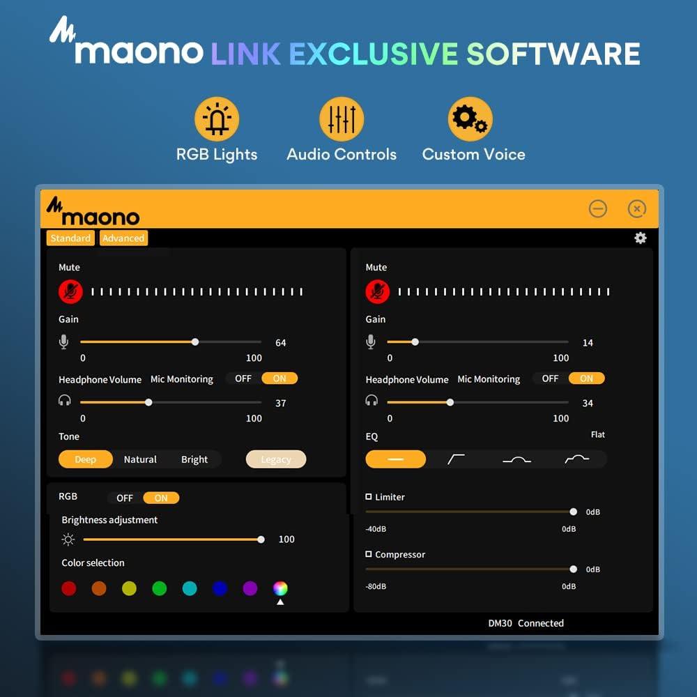 Programmable via MAONO Link Software: Maono link provides various simple audio settings, sound effects, RGB customization, mute, gain, volume, headphone monitor, and advanced audio settings. You can apply settings such as EQ, limiter, and compressor to customize your voice.
