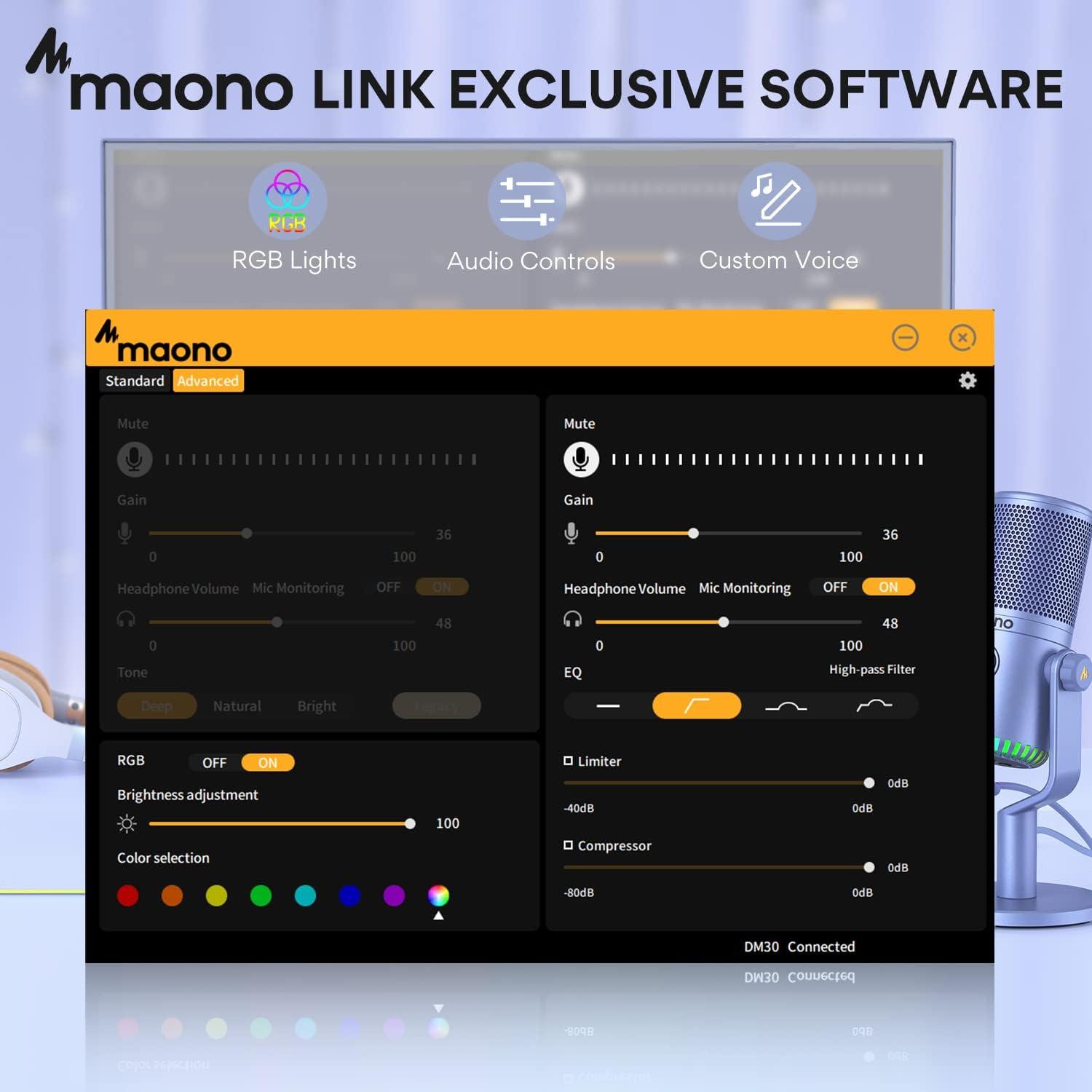 MAONO LINK Software: Maono link provides various simple audio settings, sound effects, RGB customization, and advanced audio settings. You can apply settings such as EQ, limiter, and compressor to customize your voice. Download Maono Link for extraordinary gaming and streaming experience.