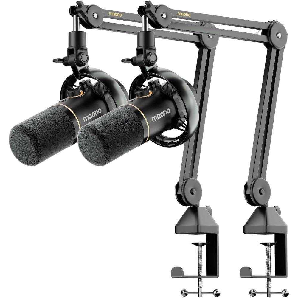 MAONO PD200W Hybrid Wireless Podcast Equipment Bundle for 2, XLR USB Dynamic Microphone Kit with 2 Desktop Stand, Software, Noise Cancellation, for Co-hosted podcast, Vocal Recording, Content Creation(PD200W-Boom arm Bundle for 2(Type-C Receiver))