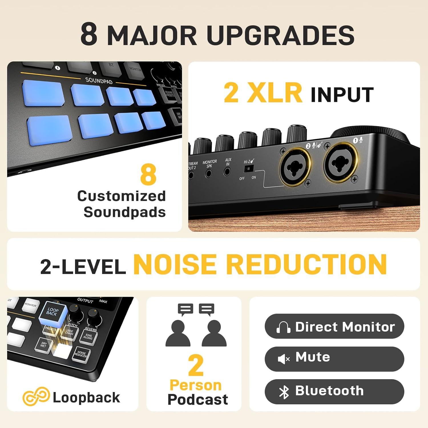 Studio-Grade XLR Clarity: The audio interface’s low-noise preamps (60dB gain) deliver pristine audio even with high-end dynamic mics. Built-in noise reduction blocks distractions like fans or hums. Skip external preamps – ideal for all skill levels
